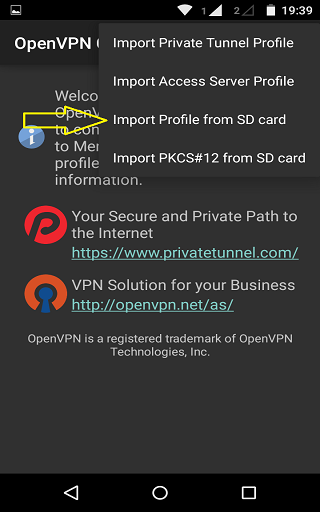 5- Abra o Openvpn vá em ‘Import / Import Profile from SD card’